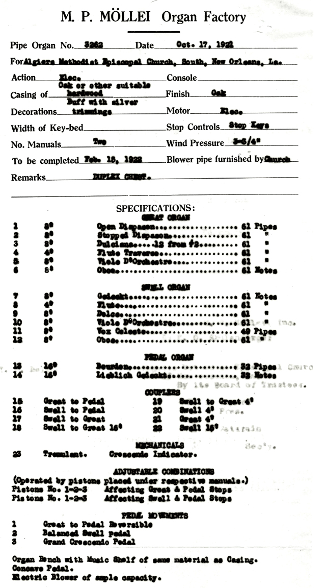 According to the OUSCDB, 1920's Moller organ Opus 3262, a 2 manual, 23 stop instrument, was installed in this church. According to church officials, the organ still exists, is being maintained, and is used on a regular basis. It is 100% functional at this time. |