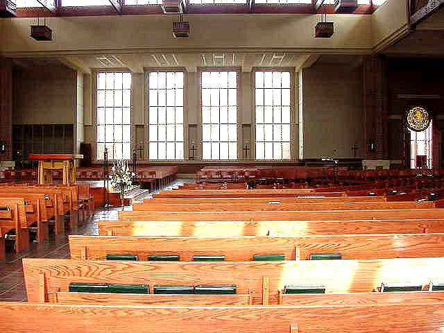 The organ installed in this church is made up of Zimmer and Sons Opus 177 which is a three manual, 17 rank instrument. The organ was relocated across the street from the original wooden church. At the time of the relocation, a new console was installed, and a Reuter organ was incorporated into the instrument bringing it to a total of 32 ranks. The pipework and pipe chamber are located at an elevated level to the right of the altar |
