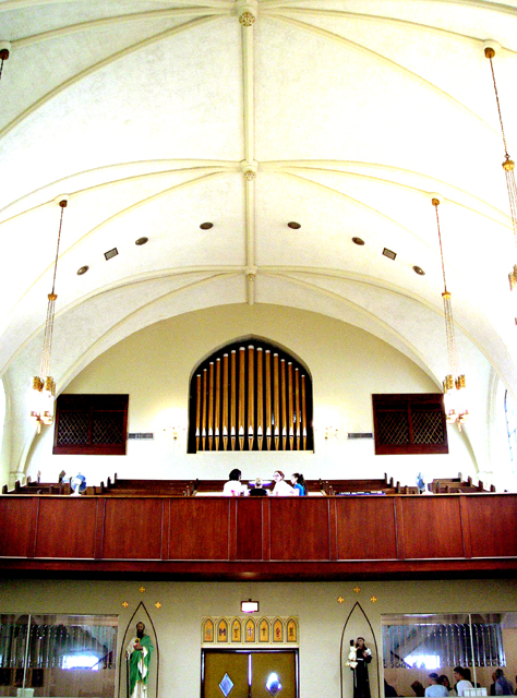 Organ constructed in 1956 by New Orleans builder August Laine. Console is by Reisner, and pipe work was recycled from various sources. |