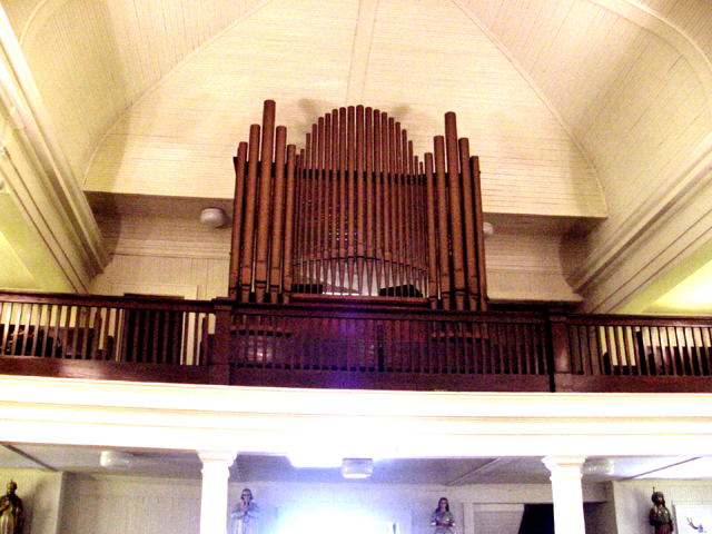 The organ shown above is an early 1900's Hinners instrument with 2 manuals, 3 divisions and 7 ranks. |