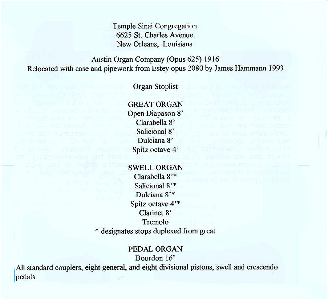 SPECIFICATIONS FOR ORGANS LOCATED AT TEMPLE SINAI |