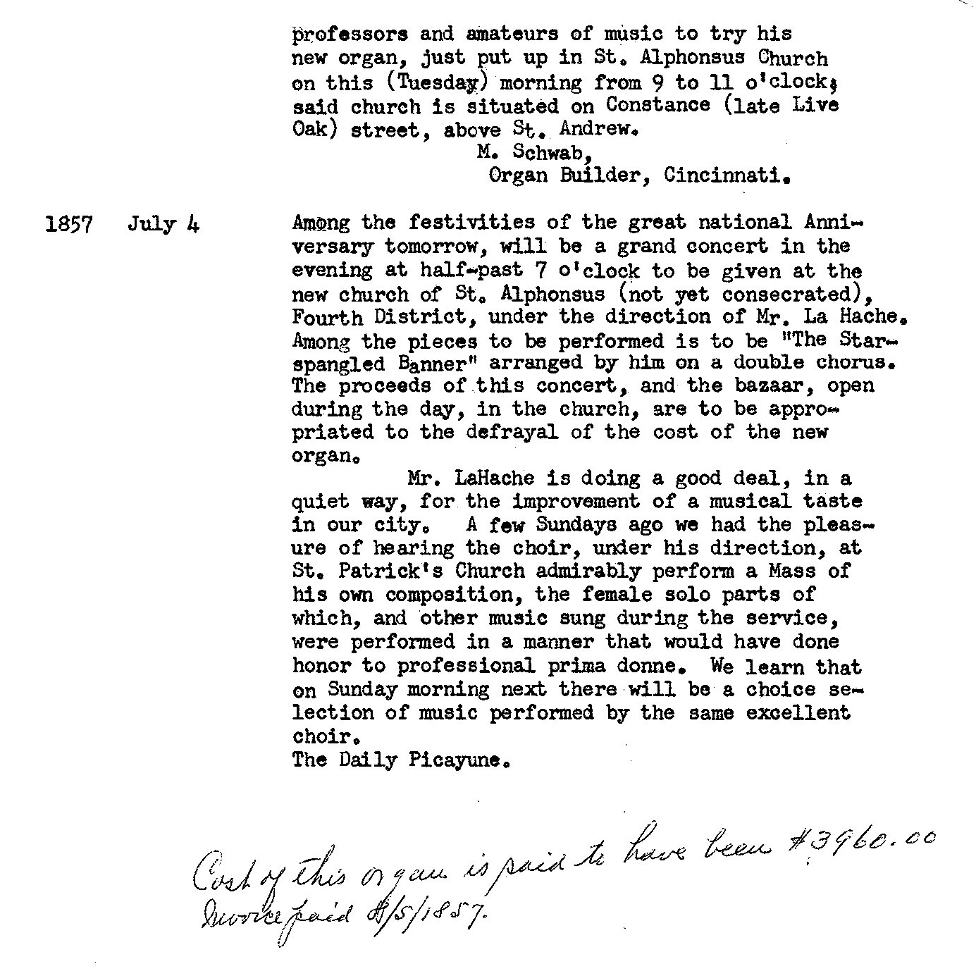 INFORMATION ON THE ORIGINAL ST. ALPHONSUS PIPE ORGAN The organ originally installed in St. Alphonsus church, was built by M. Schwab of Cincinatti, Ohio. The organ was removed in the late 1960's and all that remains presently is the original facade pipes. The following information was provided by C.J. O'Donnell of Metairie, LA. and is an exerpt from the daily diary kept by the church in the 1800's.