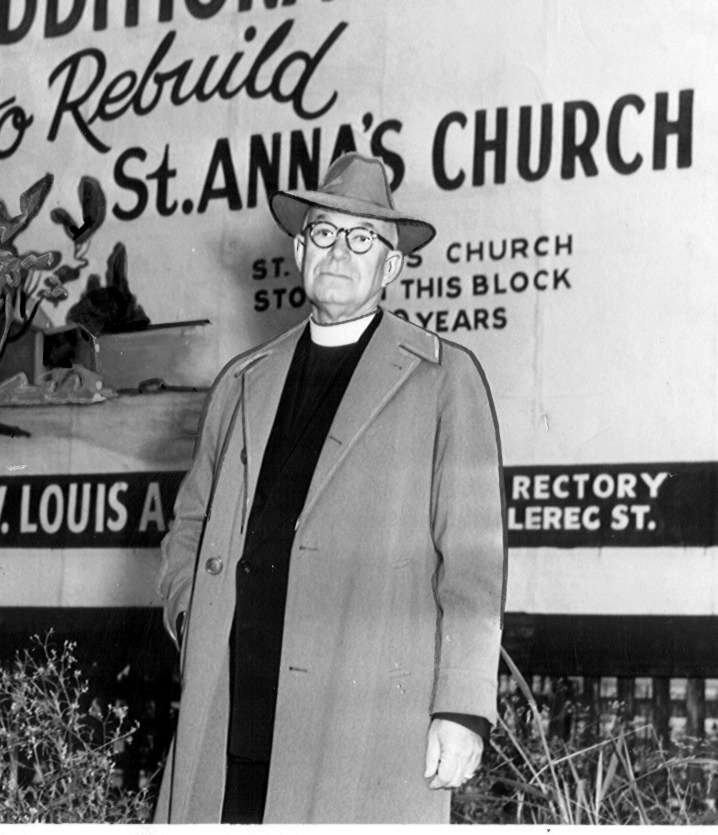 ST. ANNA'S EPISCOPAL CHURCH HISTORY The old Gothic church, shown below, is actually the third church for St. Anna. It was built in 1880 or so and condemned and torn down in 1950. The current structure was completed in 1952 under the direction of Fr. Parker. The first congregation met in 1846 at #5 Esplanade Avenue as a Seaman's Mission. Dr. Mercer, a well known philanthropist, bought the property at its current location in the 1860s and gave it to the church. The first church at this current site was a wooden church destroyed in a significant fire in the 1870s. Messers Joel Dyer and Brandon Way designed, crafted and installed the chapel (located in the Narthex) and new reredos. Much of the work is faux graining and marbling. The mural is a rare one in that it depicts the extended Holy Family, Jesus, John the Baptist, Mary and Joseph, Anna and Joachim, Zechariah, and Elizabeth and with a bit of whimsey another child who the artist claims is an unnamed cousin. I have included a photo of The Rev. Louis Parker who came in 1947 or so and was responsible for the demolition and rebuilding of the church. The old church built some where between 1875 and 1885 lost its steeple in a hurricane in 1915. It was condemned by the city in 1947 as best as we can figure. I've included a picture of Anna Mercer. The original was located at St. Anna's Asylum. That building was originally a widows and orphans home also funded and founded by Dr. Mercer located on Prytania St. and established in 1853. For a time St. Anna's Church was the governing body of the Asylum (picture included).