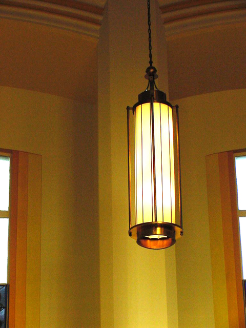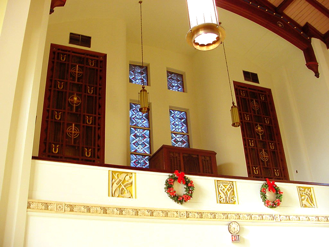 Choir loft of St. Matthias Church. The top of Wicks Opus 2309 can be seen at center. The grills intended for the original organ installation are at left and right of the stained glass window. |