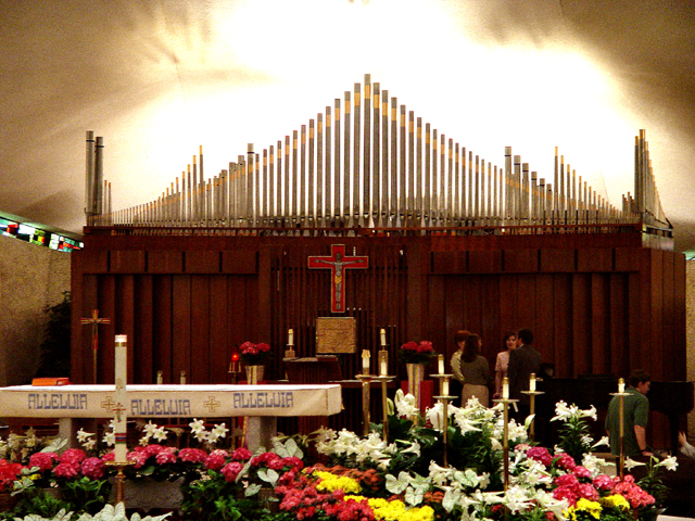 A Gus Laine installation Wicks organ, with exposed Great Division, stands