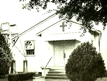 Above, the Milneburg chapel that served as the first St. Raphael Church. Below, the interim church which was located at the Prentiss and Elysian Fields site of the present church. The Hammond RT3 organ, and the choir, were located on a slightly raised wooden platform at the rear of the church to the immediate right of the entrance door. |