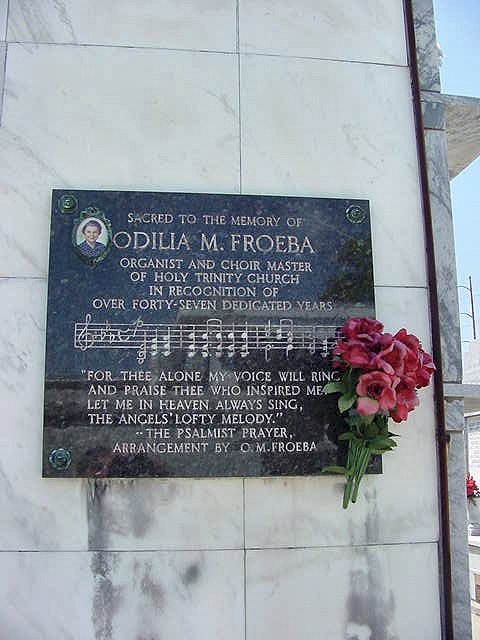 The burial site of Odilia M. Froeba who gave forty-seven years of service as the organist and choir director of Holy Trinity Church, the church of Catholic German immigrants who settled in this Bywater section of New Orleans. Although Holy Trinity Church was closed more than a decade ago, the organ which Ms. Froeba played and cared for for almost 50 years, now continues to live on as the instrument at the new St. Francis Xavier church in Metairie, Louisiana. |