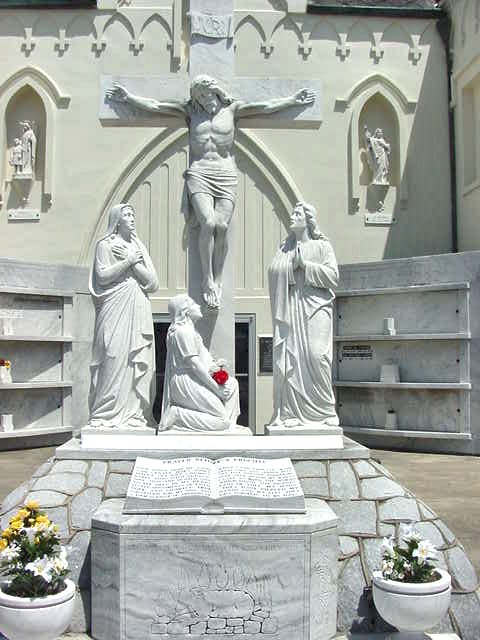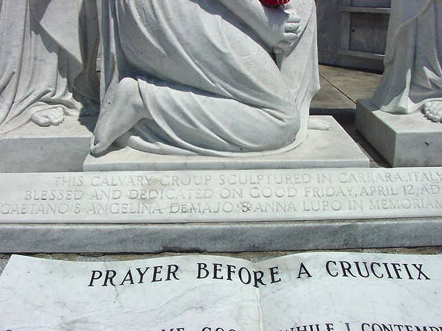 The above depicted altar and sculpture, was a gift to St. Roch Cemetery by the DeMajo and Lupo families of New Orleans, who were famous for their founding of the Central Grocery Company, one of the first Italian foods import and sales businesses in the United States. Gaetano DeMajo had this monument crated and shipped to the Vatican for blessing by Pope John XXIII prior to its installation here in the Campo Santo. |