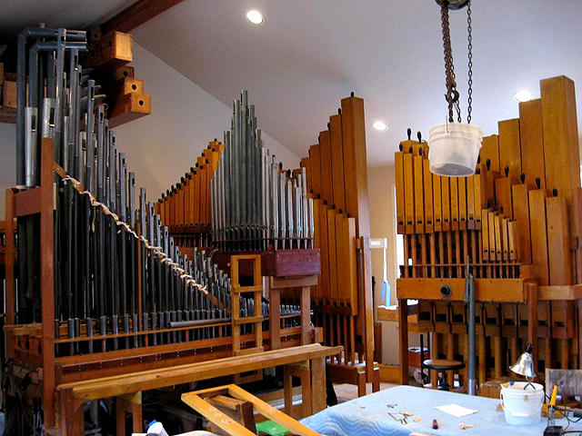 the first electric blower was installed in 1903. An inspection of the organ was performed during the post Katrina restoration, and no evidence was found of the Pilcher instrument. A 1950's Wicks instrument was found in place. The organ had sustained damage in the 2003 fire. The photo below is the new (present) organ as it was being assembled in 2008. |