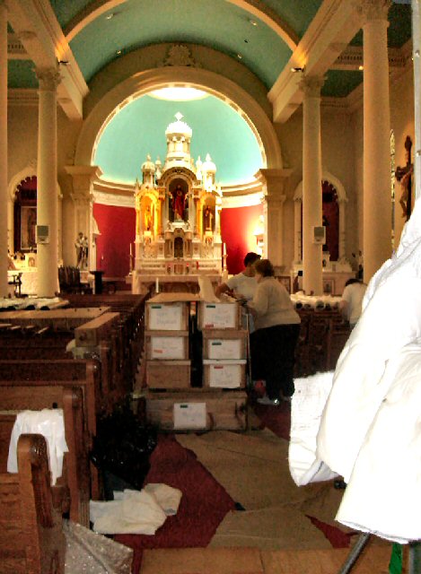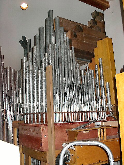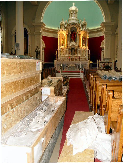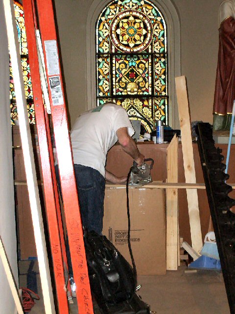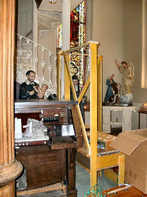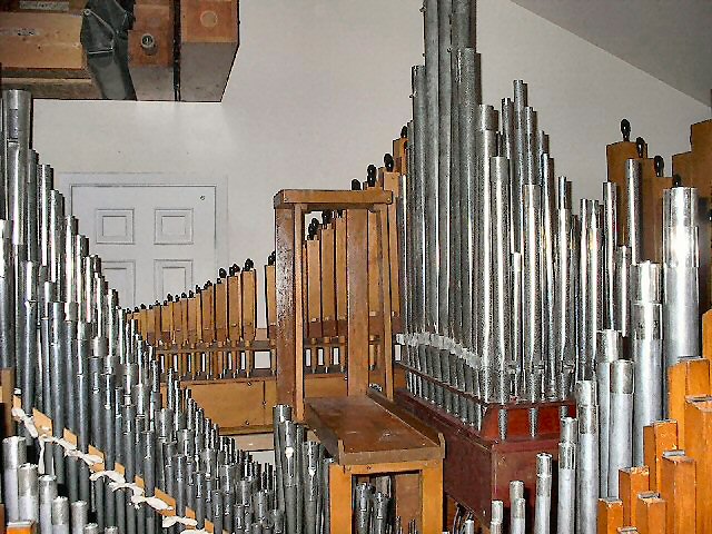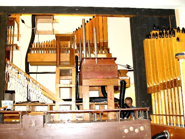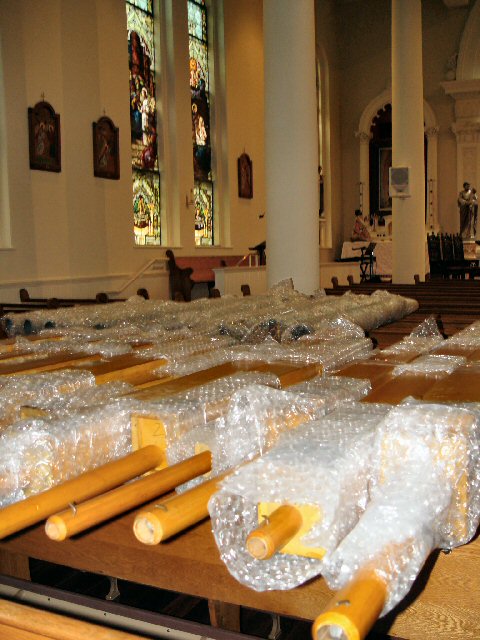 Organ components fill the sanctuary. |